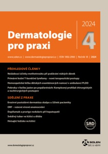www.solen.cz | www.dermatologiepropraxi.cz | ISSN 1802-2960 | Ročník 18 | 2024 Dermatologie pro praxi 20244 PŘEHLEDOVÉ ČLÁNKY Nežádoucí účinky methotrexátu při podávání nízkých dávek Primární kožní T-buněčné lymfomy – nové terapeutické postupy Homeopatická léčba dětských exantémových nemocí v ambulanci PLDD Pokroky v liečbe jaziev po popáleninách: Komplexný prehľad chirurgických a nechirurgických postupov SDĚLENÍ Z PRAXE Erozivní pustulární dermatóza skalpu u 32leté pacientky ORF – vzácné virové onemocnění Dupilumab a prurigo nodularis při hepatopatii Svědivý tuber ve kštici u dítěte Hnisající ložisko ve kštici www.dermatologiepropraxi.cz